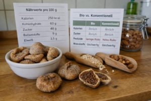 Im Vergleich zu Süßigkeiten wirken die getrocknete Feigen Nährwerte deutlich natürlicher – jedoch mit hoher Kaloriendichte.