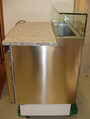 Breite: 93,00 cm Tiefe: 70,00 cm Höhe: 91,00 cm E-Anschluß: 230 V Leistung: 2 TÜREN Temperaturbereich: 0ø/+10øC Beschreibung: mit Edelstahlaufsatz - Beschleunigt die Arbeitsabläufe und hält die Zutaten länger frisch. Innen und außen Edelstahl 18/10, Umluftkühlsystem (Behälter extra nach Bedarf bestellen), steckerfertig, 230 V. 690,- € zzgl. 19% MwSt.